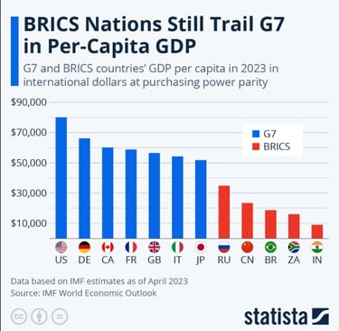 Although the BRICS in aggregate are large, the per‑capita GDP of G7 members remains far higher, which means more consumption power per person, better human capital and more innovation.